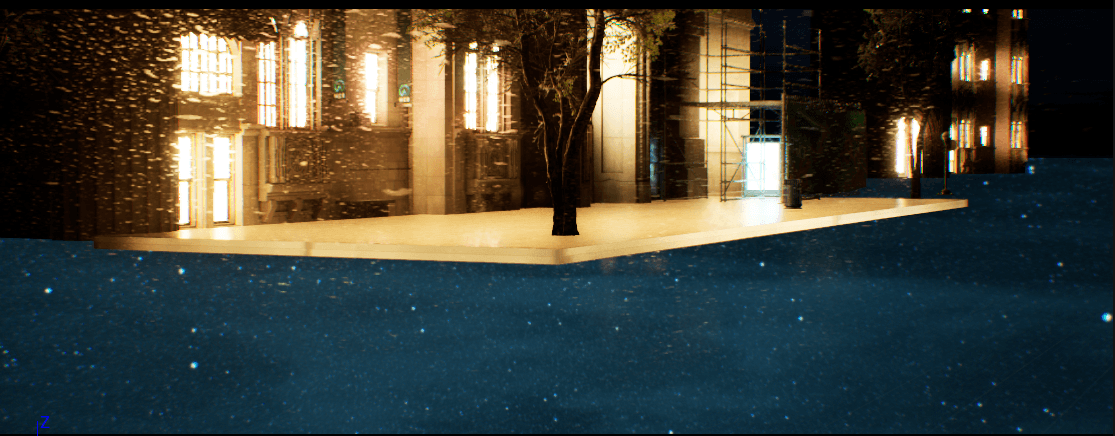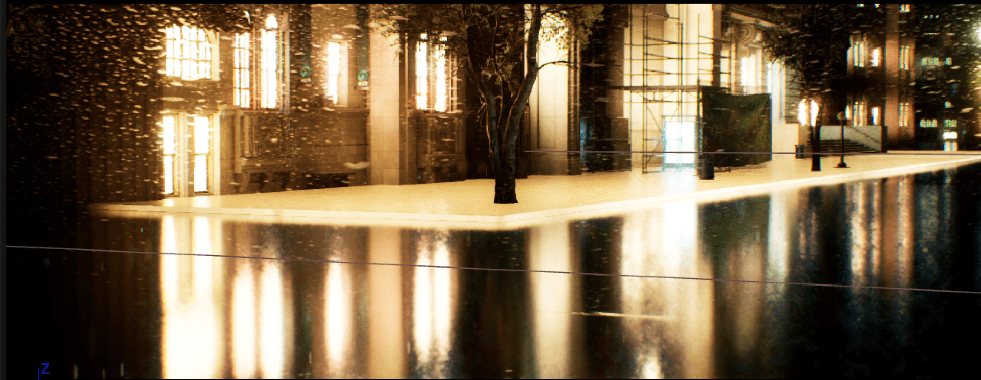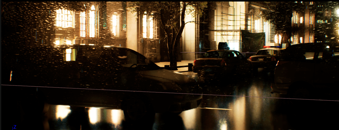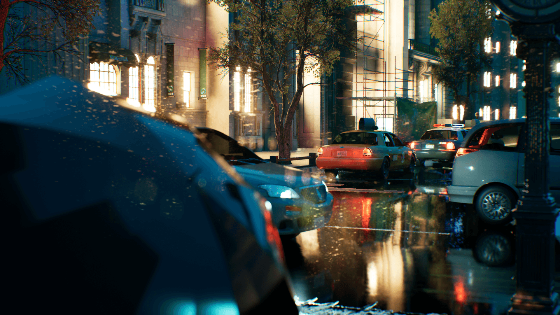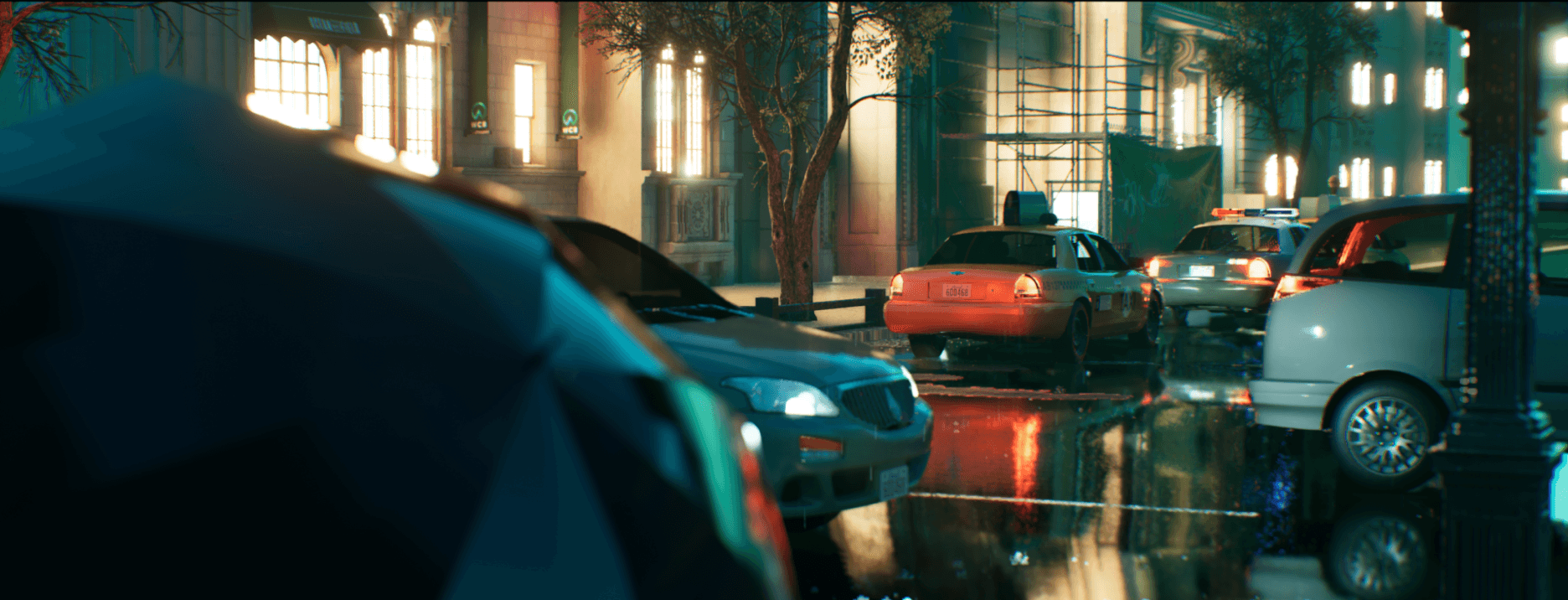 I selected assets with a classic British architectural style to construct the backdrop. Scaffolding and trees were added as accents, while the smooth, reflective pavement captured the glow of lights, enhancing the quiet, moody atmosphere of a rainy day. The softly lit buildings and hazy details provide depth and context, but they remain understated to keep attention on the mid ground action.