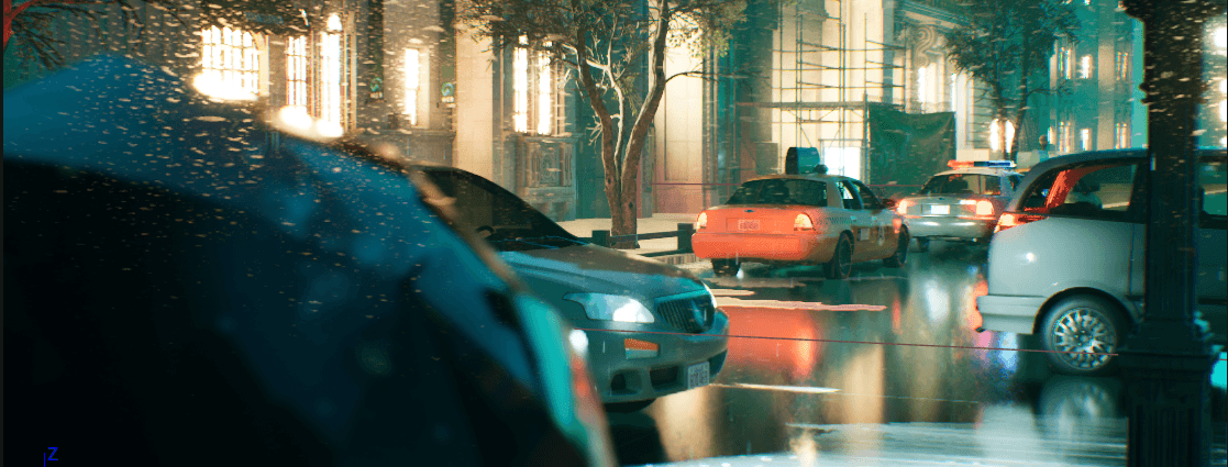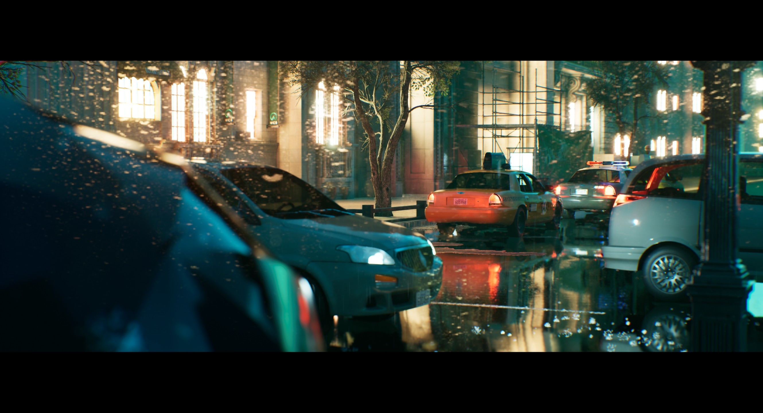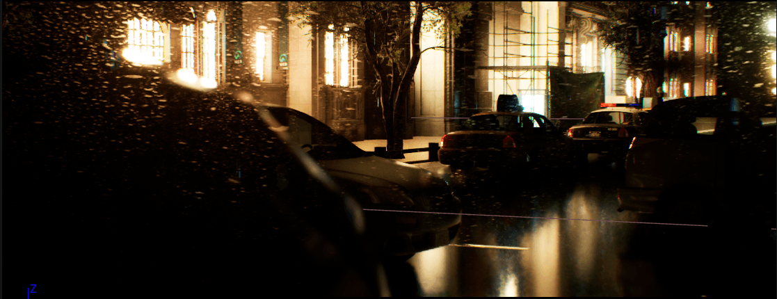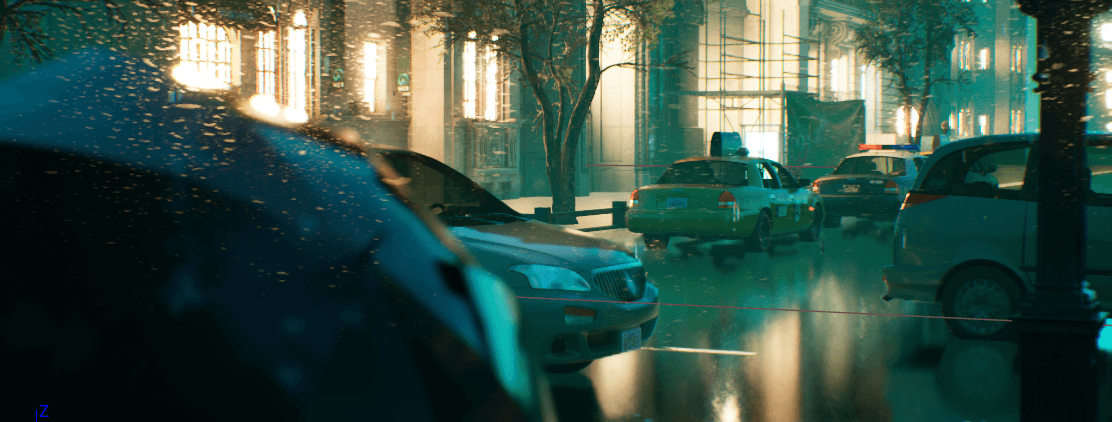 To heighten the rainy atmosphere, I add the rain effect and I applied a water droplet mask to the camera, simulating the look of raindrops on a lens and adding to the wet, immersive feel of the scene.