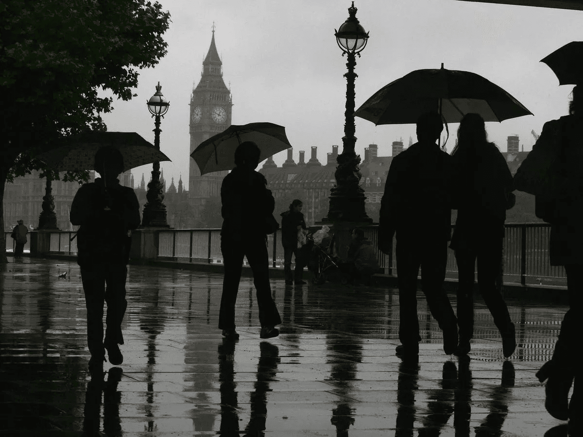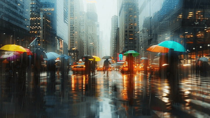 I used blurred pedestrians with umbrellas and a vintage street clock to add a sense of life and guide the viewer’s attention to the midground.