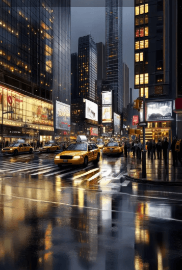 The moving cars on the wet, reflective streets are the central focus of the scene. Their placement and lighting create natural visual lines that draw the eye and add energy to the composition.
